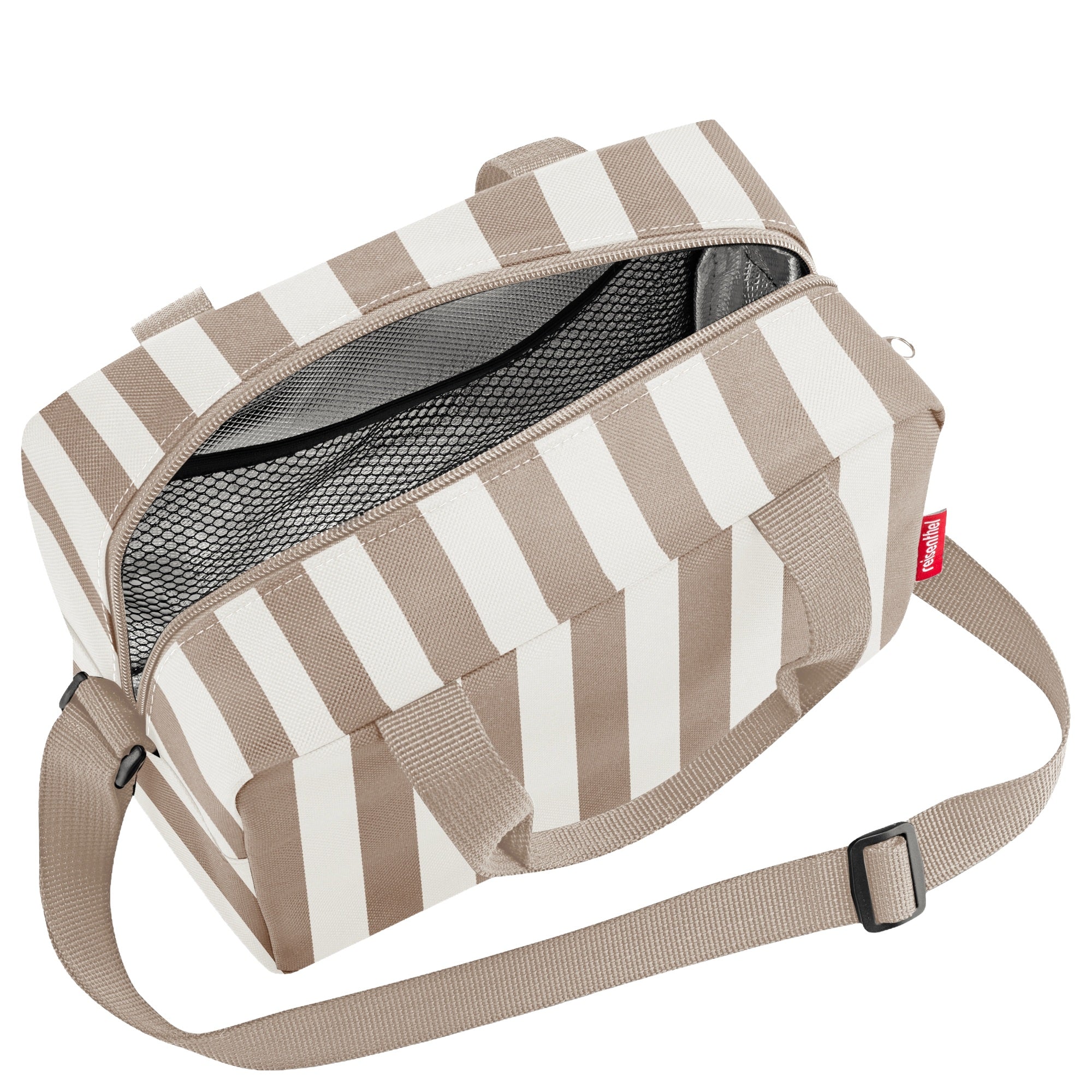 Die reisenthel coolerbag to-go in der Farbe summerstripes coffee ist eine kompakte Kühltasche, die speziell für den Transport von Speisen unterwegs entwickelt wurde. Mit einem Volumen von 3 Litern bietet sie ausreichend Platz für Lunchboxen und Snacks, ideal für Arbeitstage, Ausflüge oder Picknicks.