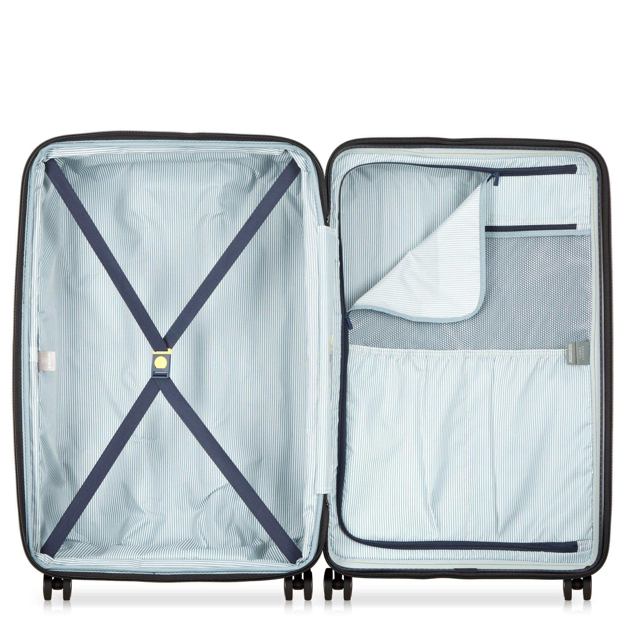 The Delsey Paris Longitude 4-wheel trolley in light blue is a functional companion for frequent travelers who value durability and comfort. With a height of 81 cm, it offers ample space for longer trips.