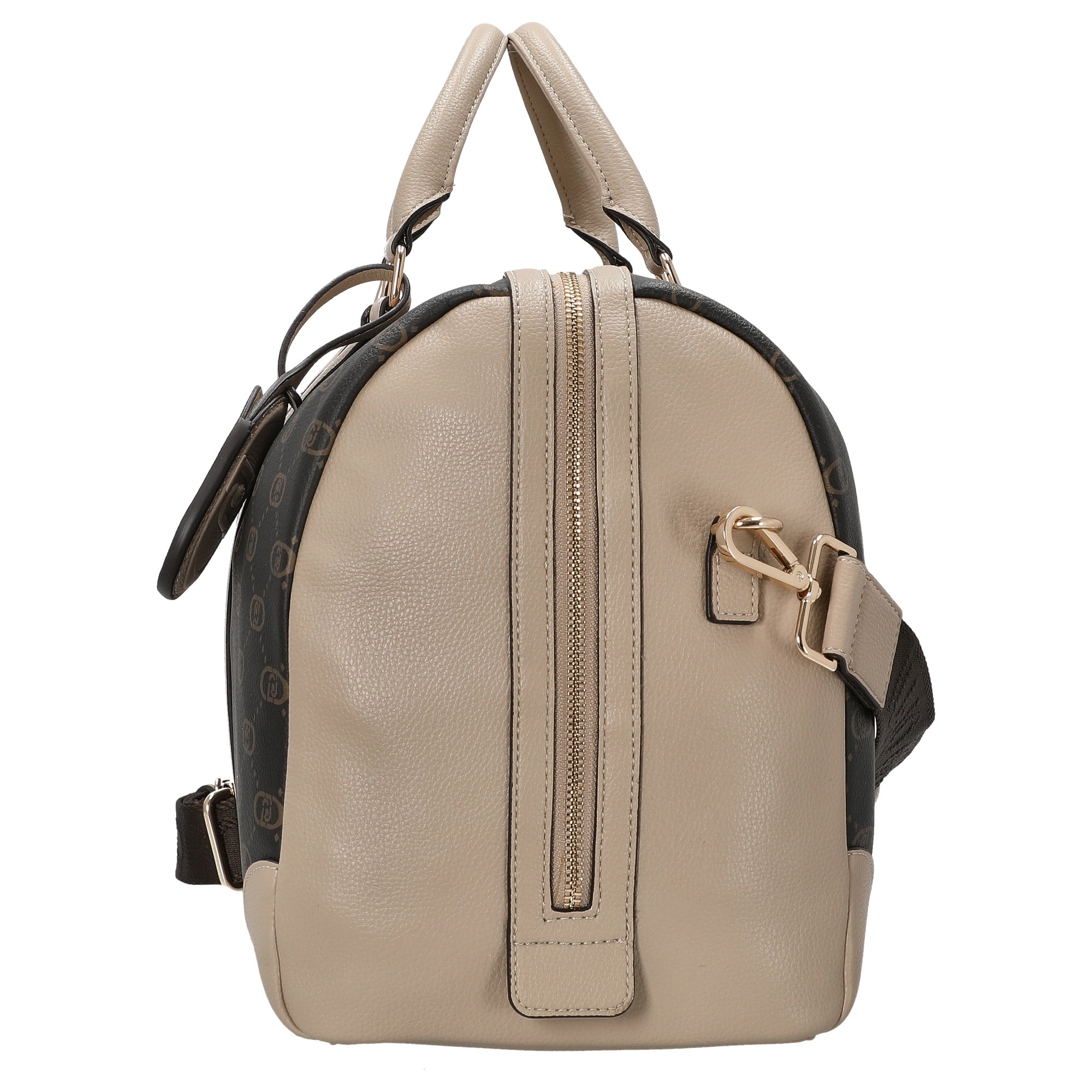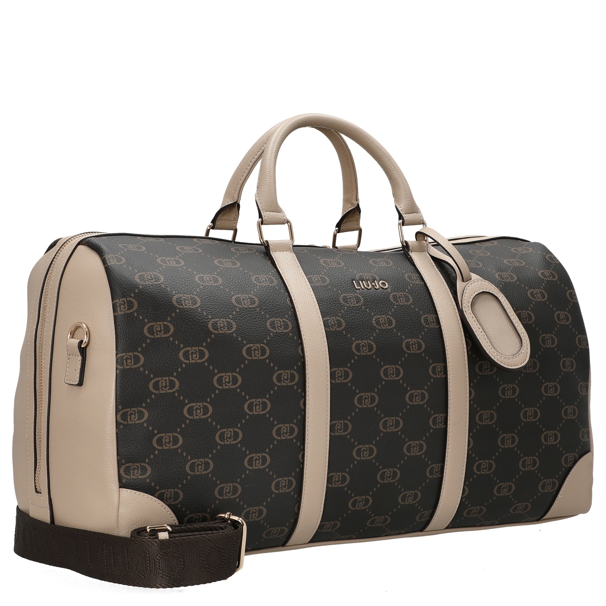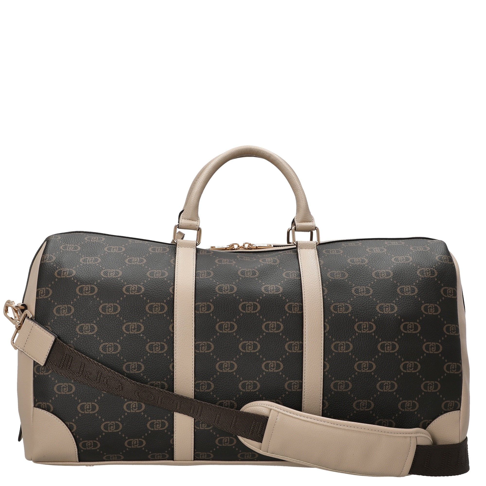 Die Liu Jo Citty Duffle Bag in elegantem dunkelbraun mit beigen Akzenten ist die perfekte Reisetasche für stilbewusste Vielreisende. Mit ihrem klassischen, zylindrischen Design und dem markanten Logo-Muster verbindet sie zeitlose Eleganz mit praktischer Funktionalität – ideal für Wochenendtrips, Businessreisen oder den Alltag.