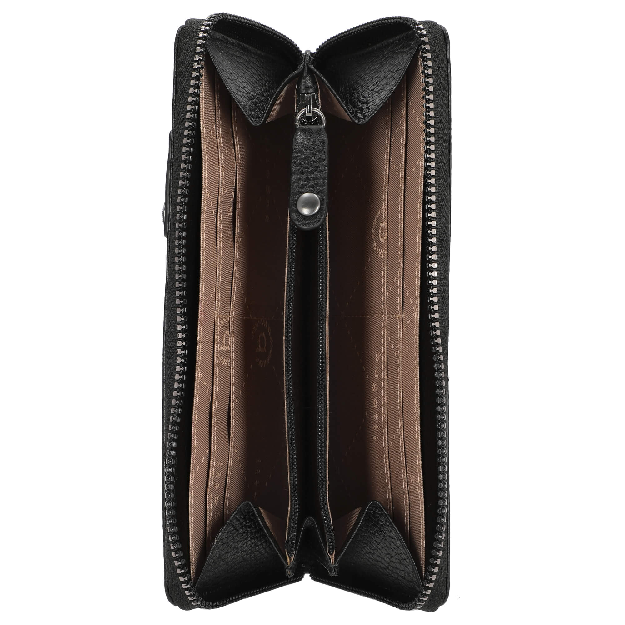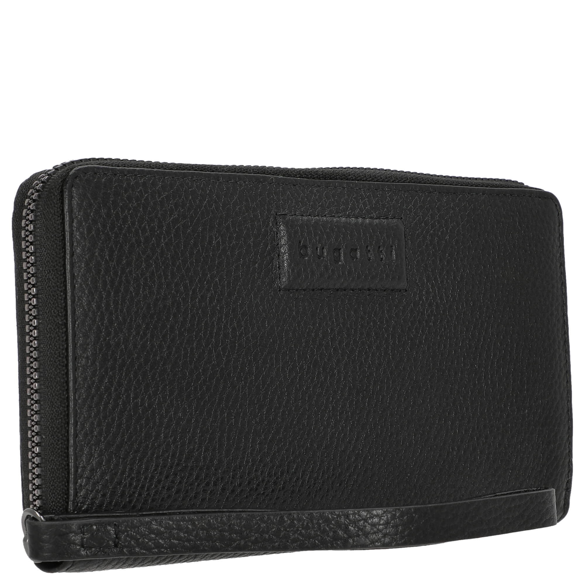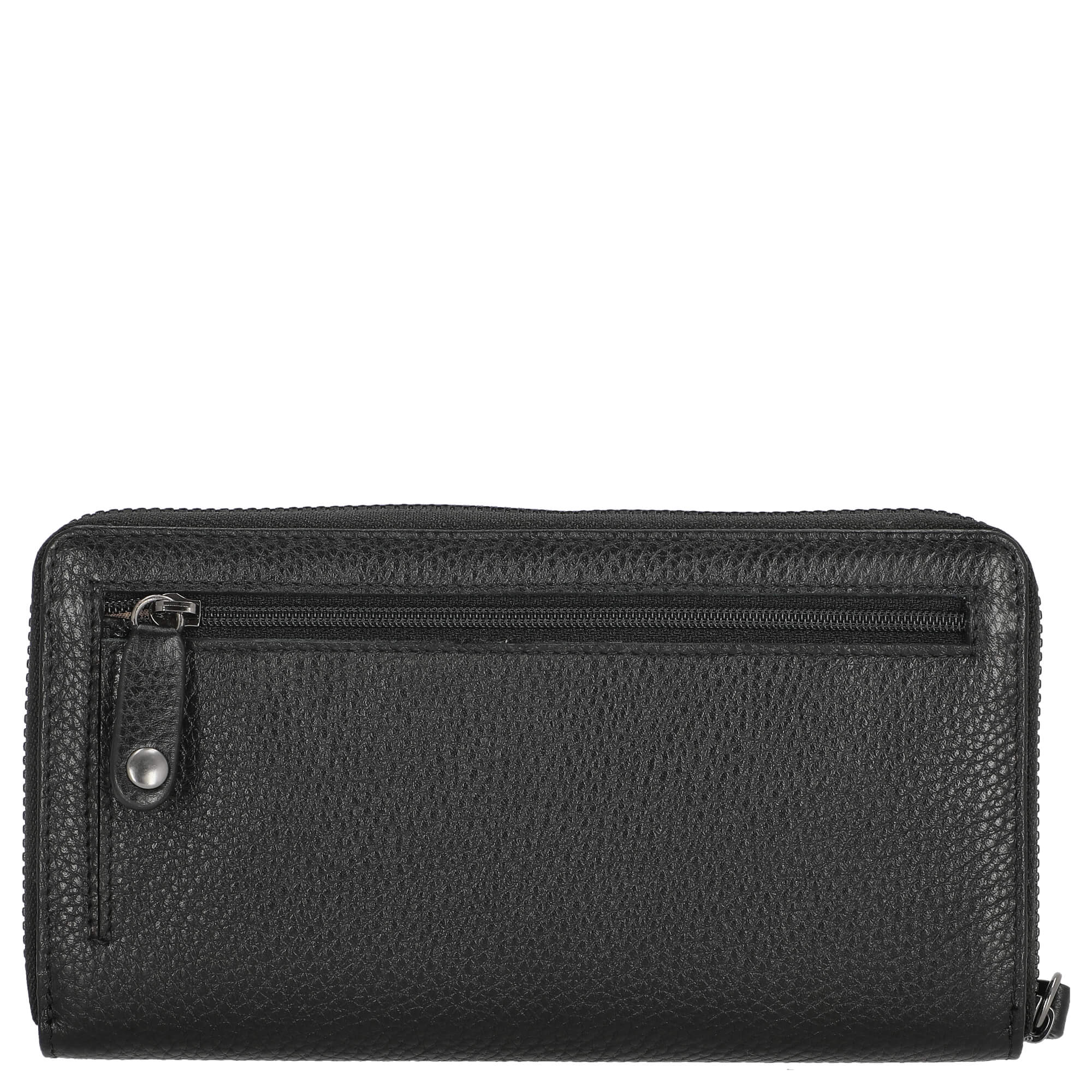 Il lato esterno del portafoglio è chiuso da una zip perimetrale, che non solo garantisce sicurezza, ma sottolinea anche il design elegante. Un pratico cinturino per la mano facilita il trasporto e assicura che il portafoglio sia sempre a portata di mano.