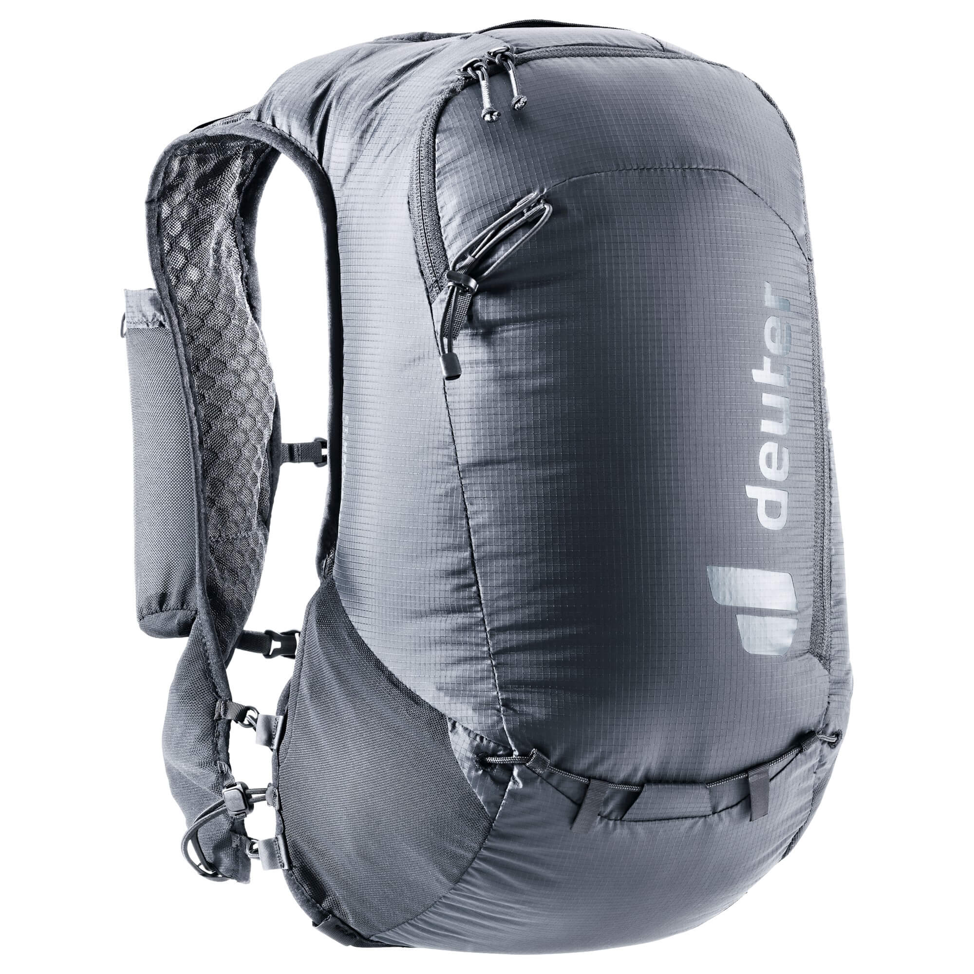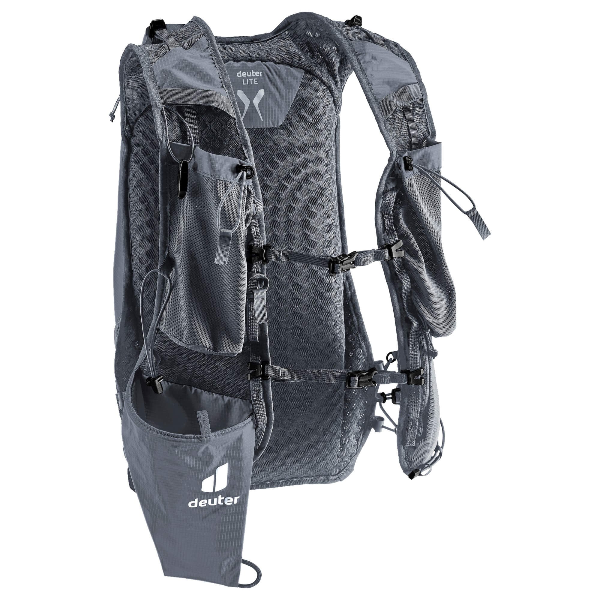 Le caratteristiche esterne includono due tasche laterali elastiche, ideali per softflask, e una tasca con zip sulla spallina per il vostro smartphone o GPS. Con il supporto per bastoni a fondina, avrete sempre i vostri bastoni a portata di mano.