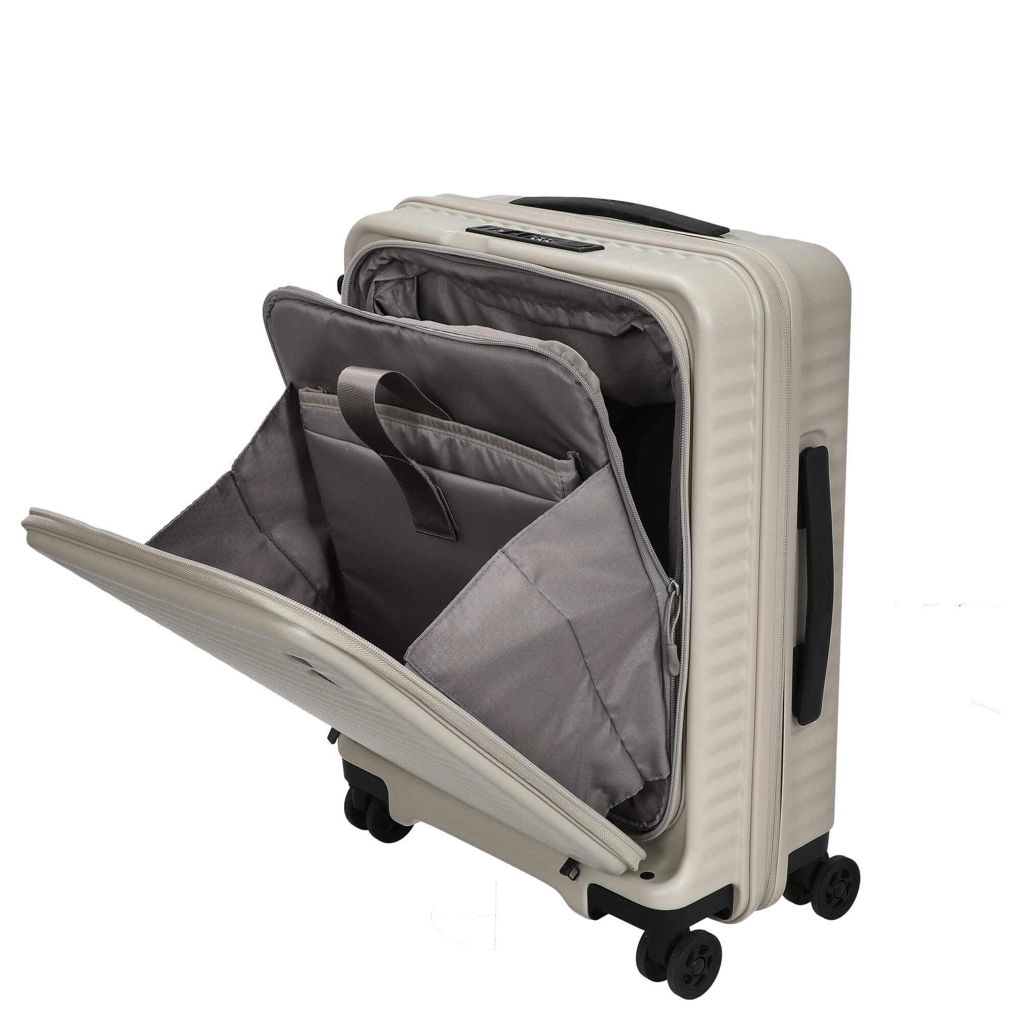 Scoprite il trolley da cabina a 4 ruote Echolac Celestra FA nel elegante colore White Sand. Questa valigia combina un design stiloso con una funzionalità ben pensata ed è il compagno ideale per i vostri viaggi. Con un peso di soli 3,20 chilogrammi e un volume espandibile fino a 43 litri, offre ampio spazio per tutti i vostri accessori da viaggio.