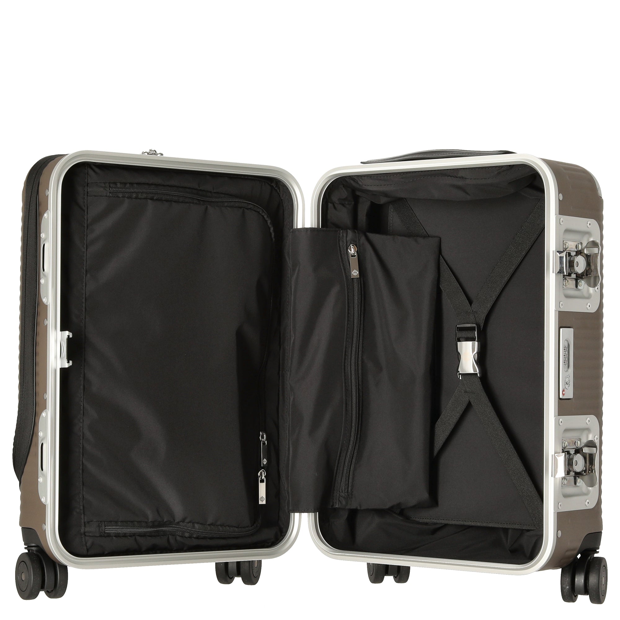 Il trolley è dotato di una serratura TSA integrata, particolarmente vantaggiosa per i viaggi negli Stati Uniti. La pratica tasca frontale consente un accesso rapido al laptop e ad altri oggetti importanti, mentre le due maniglie in pregiata pelle italiana con logo FPM inciso aggiungono un tocco di lusso.