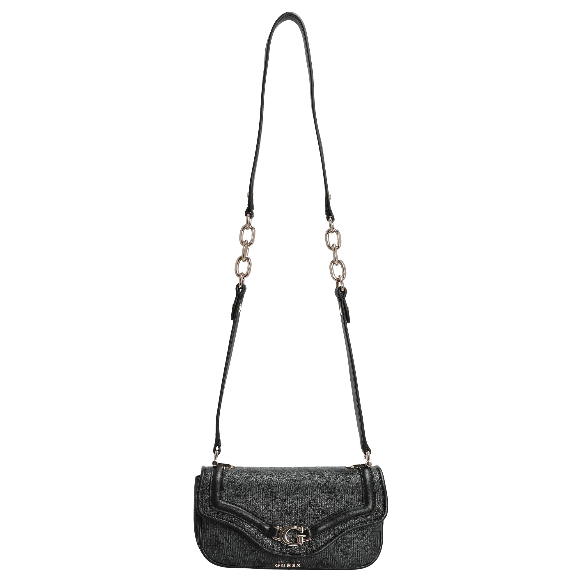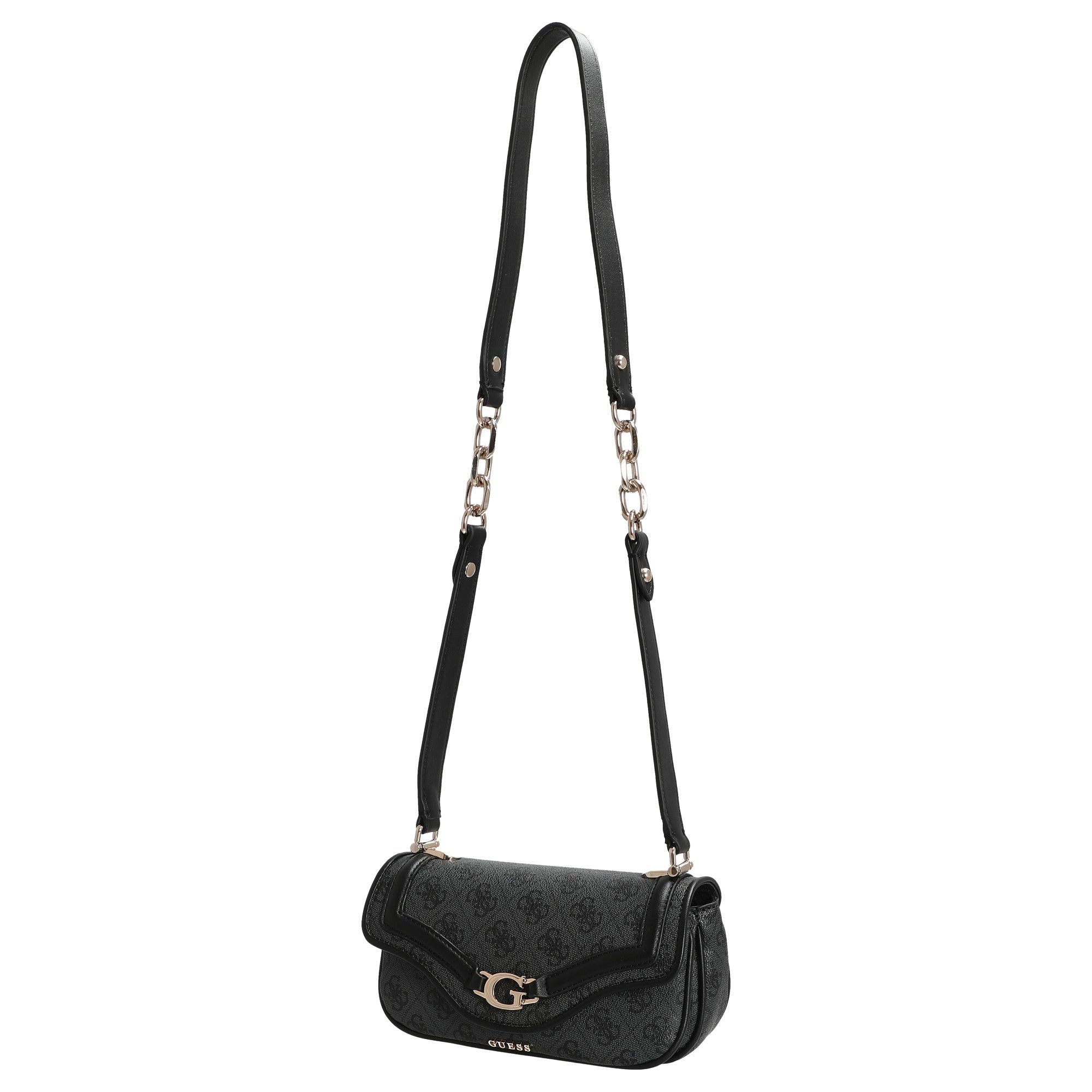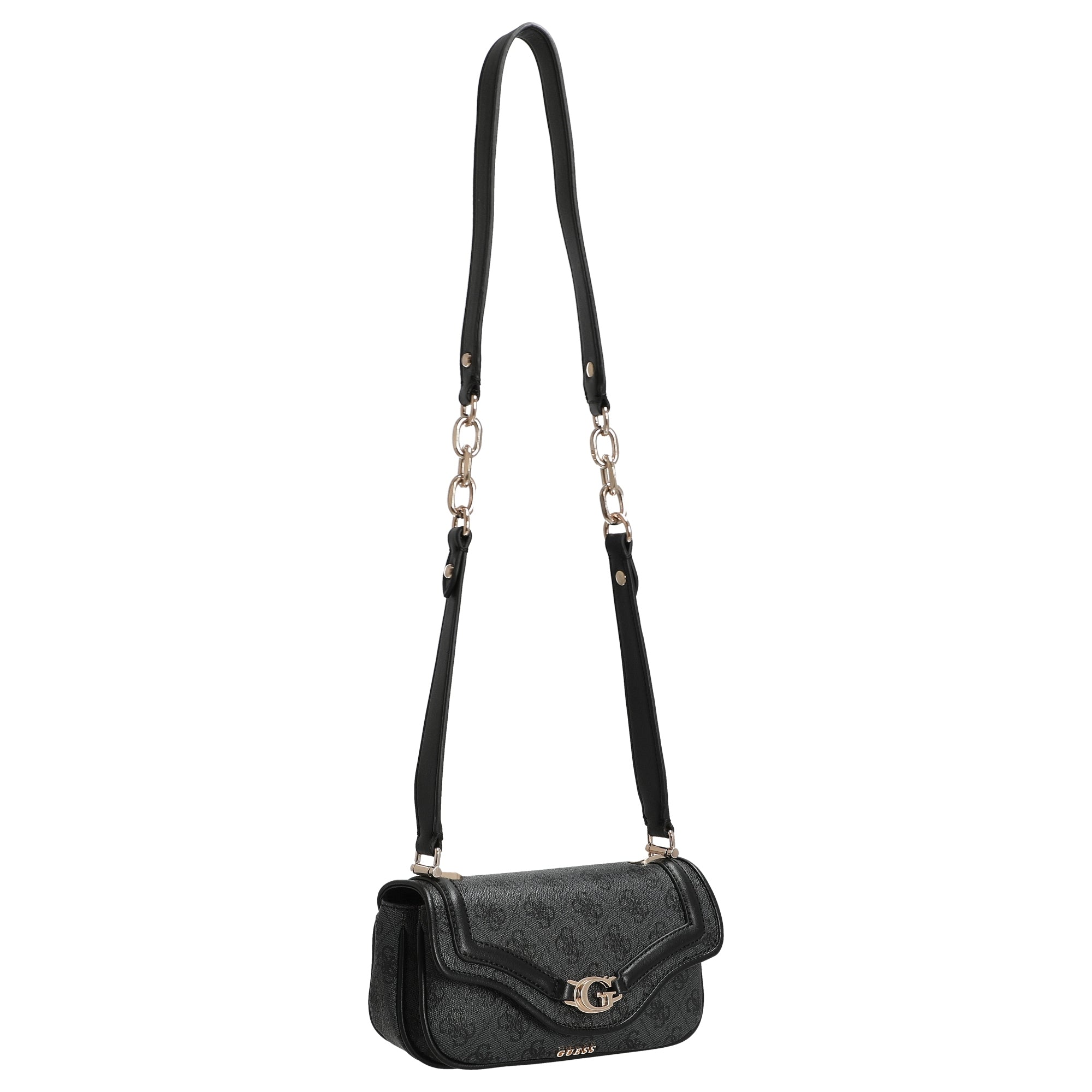 Die Guess Dea Flap Umhängetasche in elegantem Schwarz vereint modisches Design mit durchdachter Funktionalität. Das hochwertige Kunstleder besticht durch seine feine Prägung und die hellgoldfarbenen Metallakzente setzen stilvolle Glanzpunkte, die der Tasche eine edle Note verleihen.