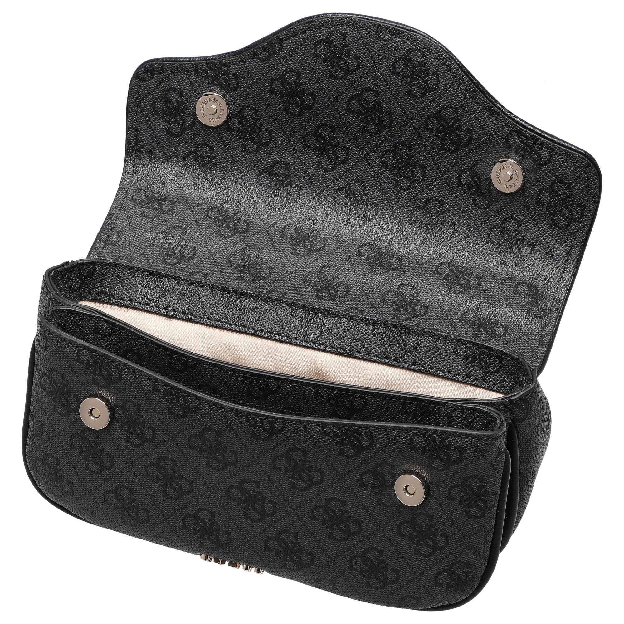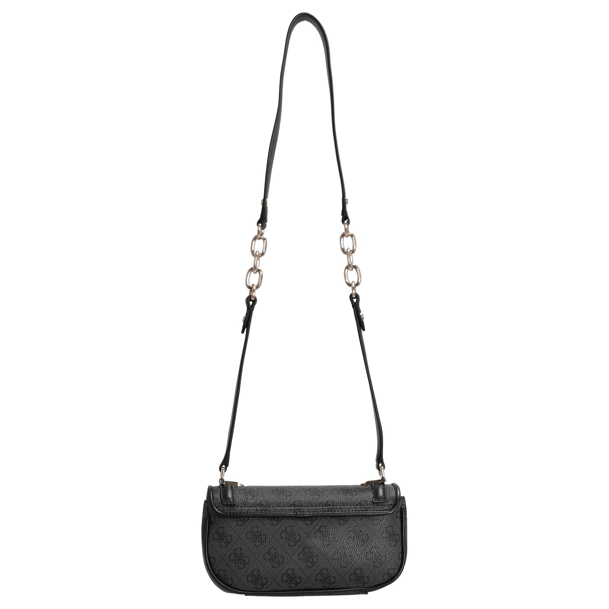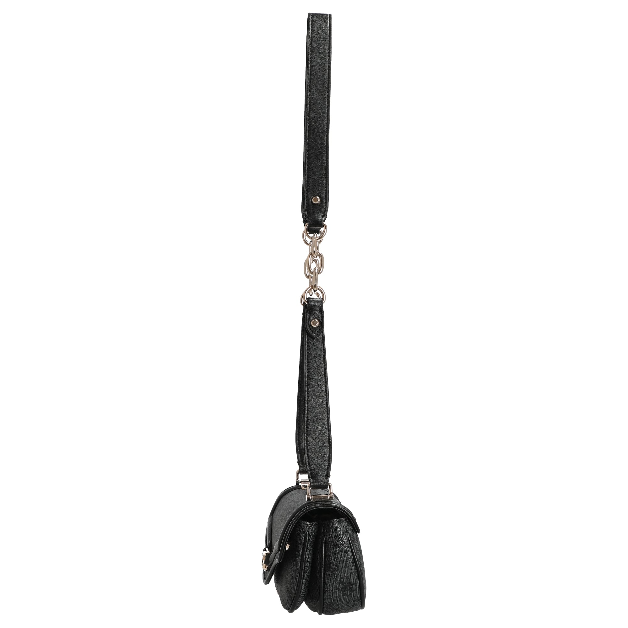 Die Guess Dea Flap Umhängetasche in elegantem Schwarz vereint modisches Design mit durchdachter Funktionalität. Das hochwertige Kunstleder besticht durch seine feine Prägung und die hellgoldfarbenen Metallakzente setzen stilvolle Glanzpunkte, die der Tasche eine edle Note verleihen.