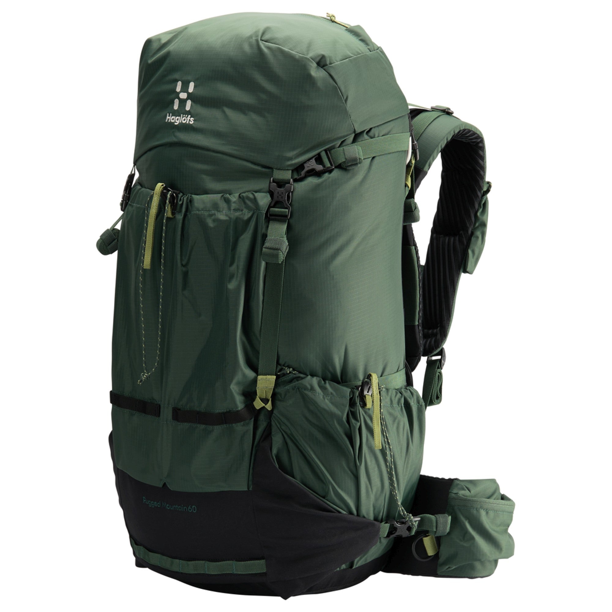Scoprite lo zaino da trekking Haglöfs Rugged Mountain 60 nel elegante colore fjell green/true black. Questo zaino unisce funzionalità e sostenibilità, ed è realizzato con materiali riciclati. È stato progettato specificamente per ridurre l'uso di materiali elastici non riciclabili.