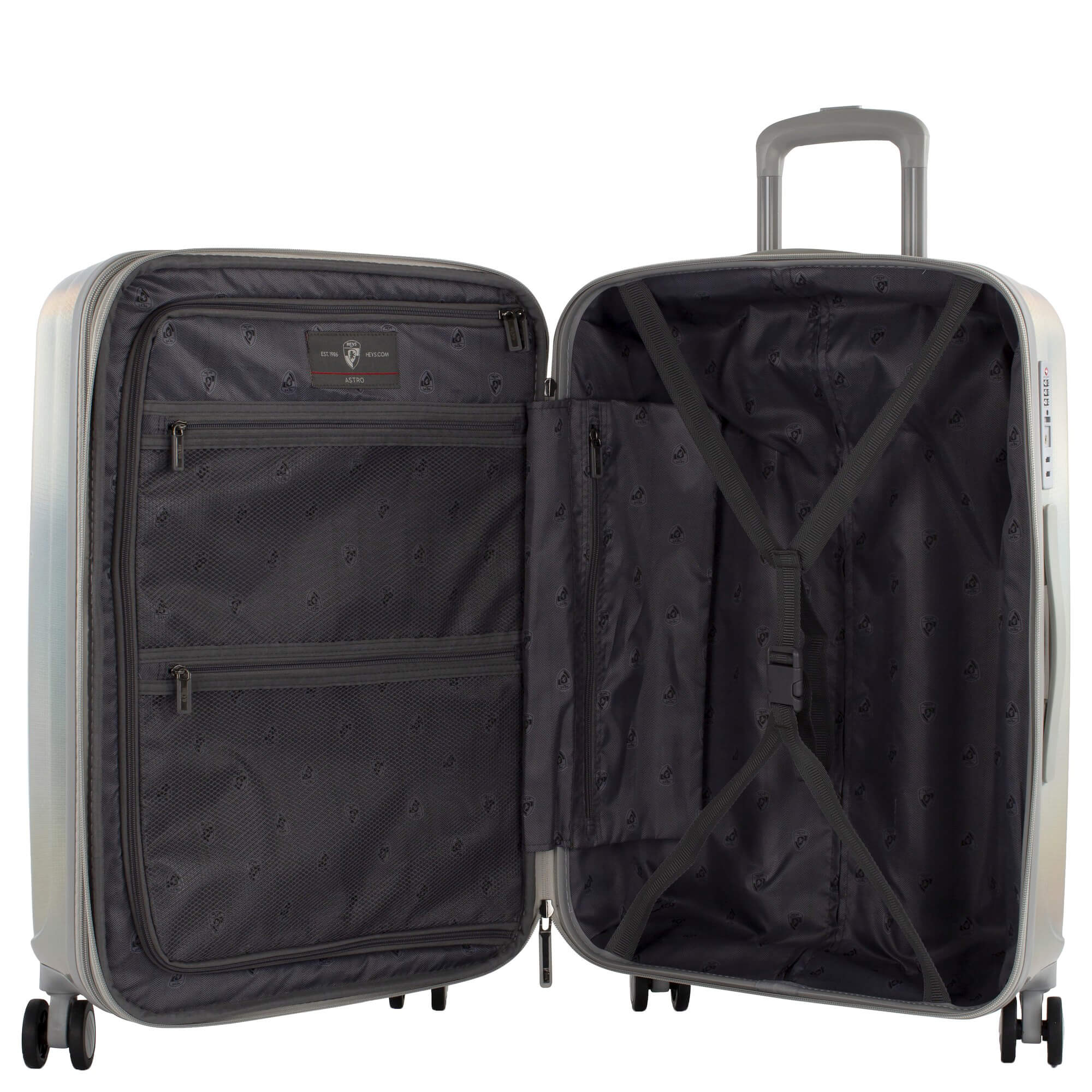 Con un peso di soli 3,90 chilogrammi, questo trolley non è solo leggero, ma offre anche ampio spazio per i vostri viaggi. Il trolley Heys Astro a 4 ruote in argento è la scelta perfetta per chi desidera unire funzionalità e stile.