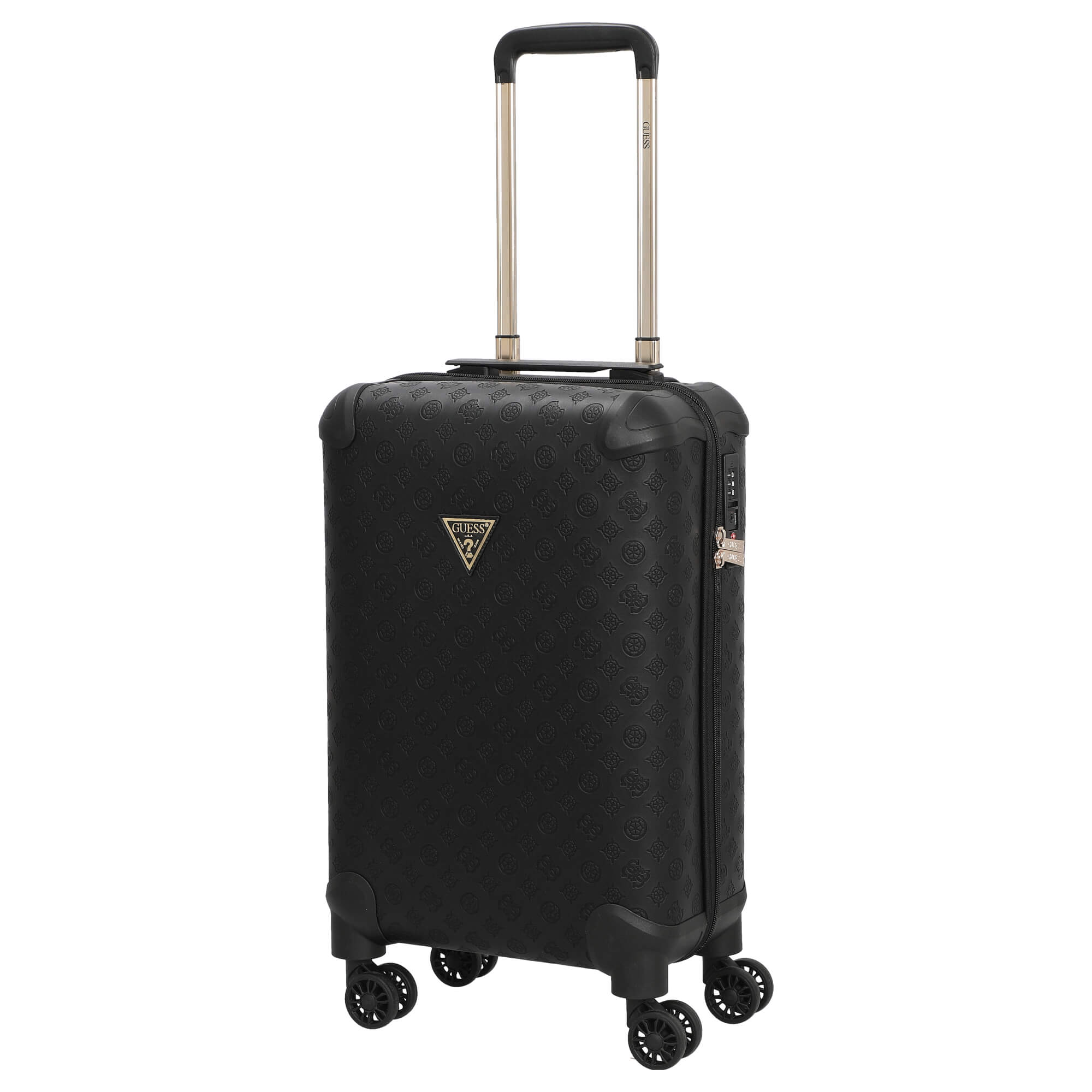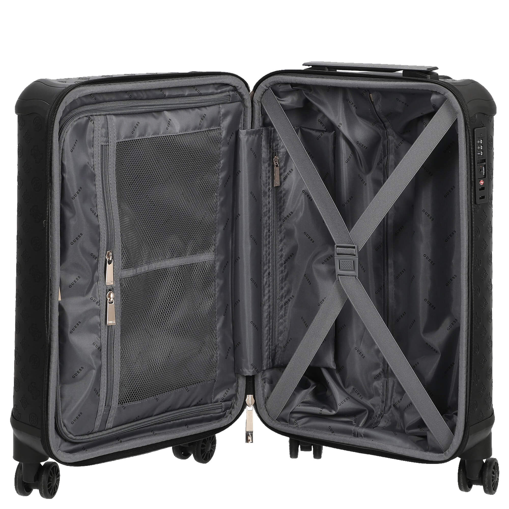 Scoprite il trolley elegante della collezione Wilder di Guess in colore nero, che non solo colpisce per il suo design stiloso, ma anche per la sua funzionalità ben pensata. Questo piccolo trolley è il compagno perfetto per i vostri viaggi, sia di lavoro che privati.
