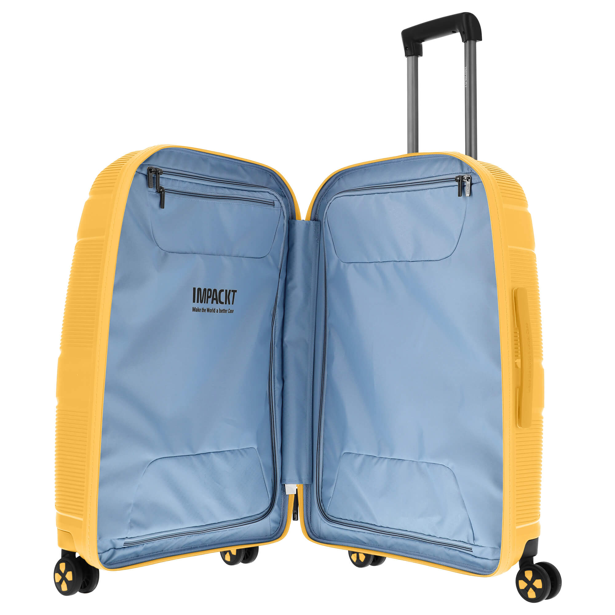 Il Impackt IP1 - trolley a 4 ruote nel brillante colore Sunset Yellow è il compagno perfetto per i tuoi viaggi. Con un peso di soli 3,50 chilogrammi e un volume generoso di 73 litri, questa valigia non solo offre spazio sufficiente per il tuo bagaglio, ma si distingue anche per le sue funzioni ben progettate e una produzione ecologica.