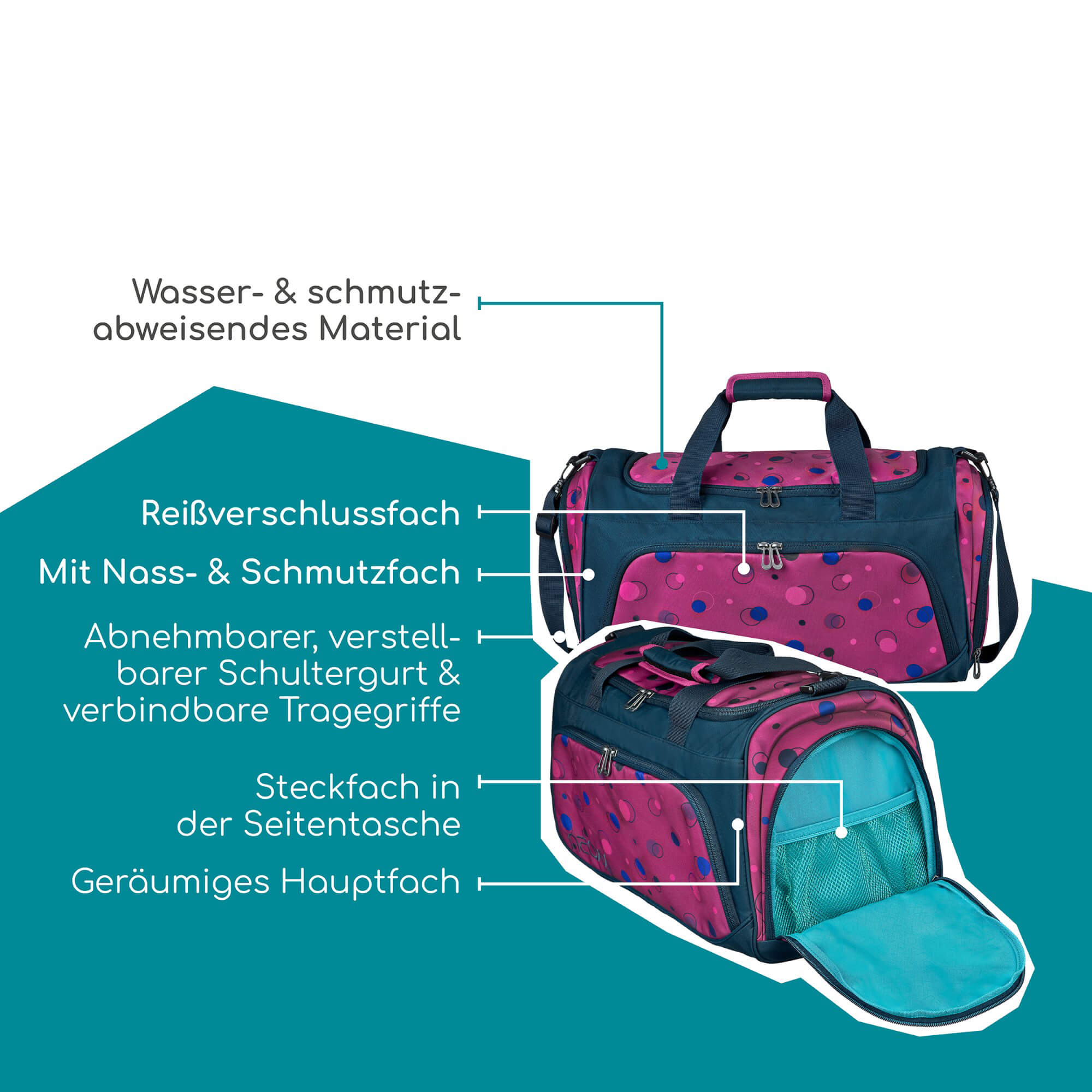 La borsa sportiva MOVE unisce funzionalità e stile ed è il compagno perfetto per il vostro allenamento o per l'educazione fisica. Godetevi la combinazione di caratteristiche pratiche e un design moderno in Bubble me around.