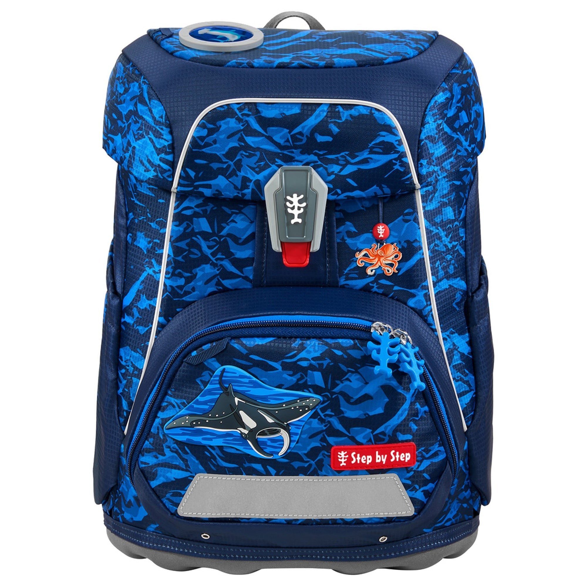 Il zaino scolastico Step by Step Fit nel fresco design Manta Rio convince per l'ergonomia ben studiata e l'alta sicurezza nella vita scolastica quotidiana. Con un volume di 19 litri offre spazio sufficiente per libri e quaderni, mentre il peso leggero di soli 0,99 chilogrammi protegge la schiena.