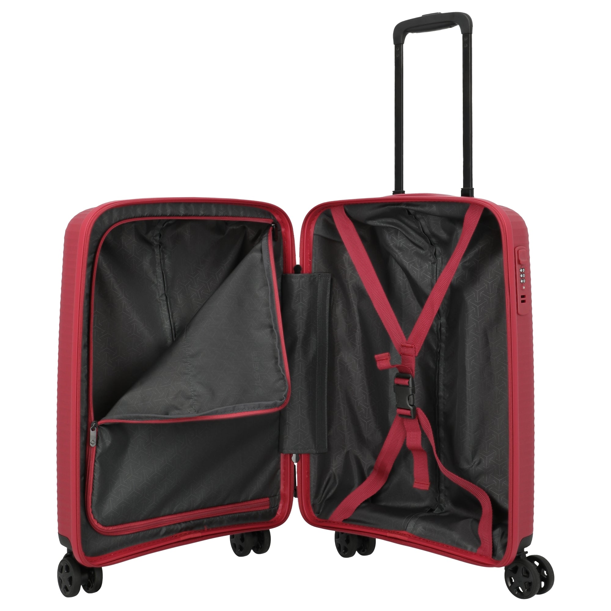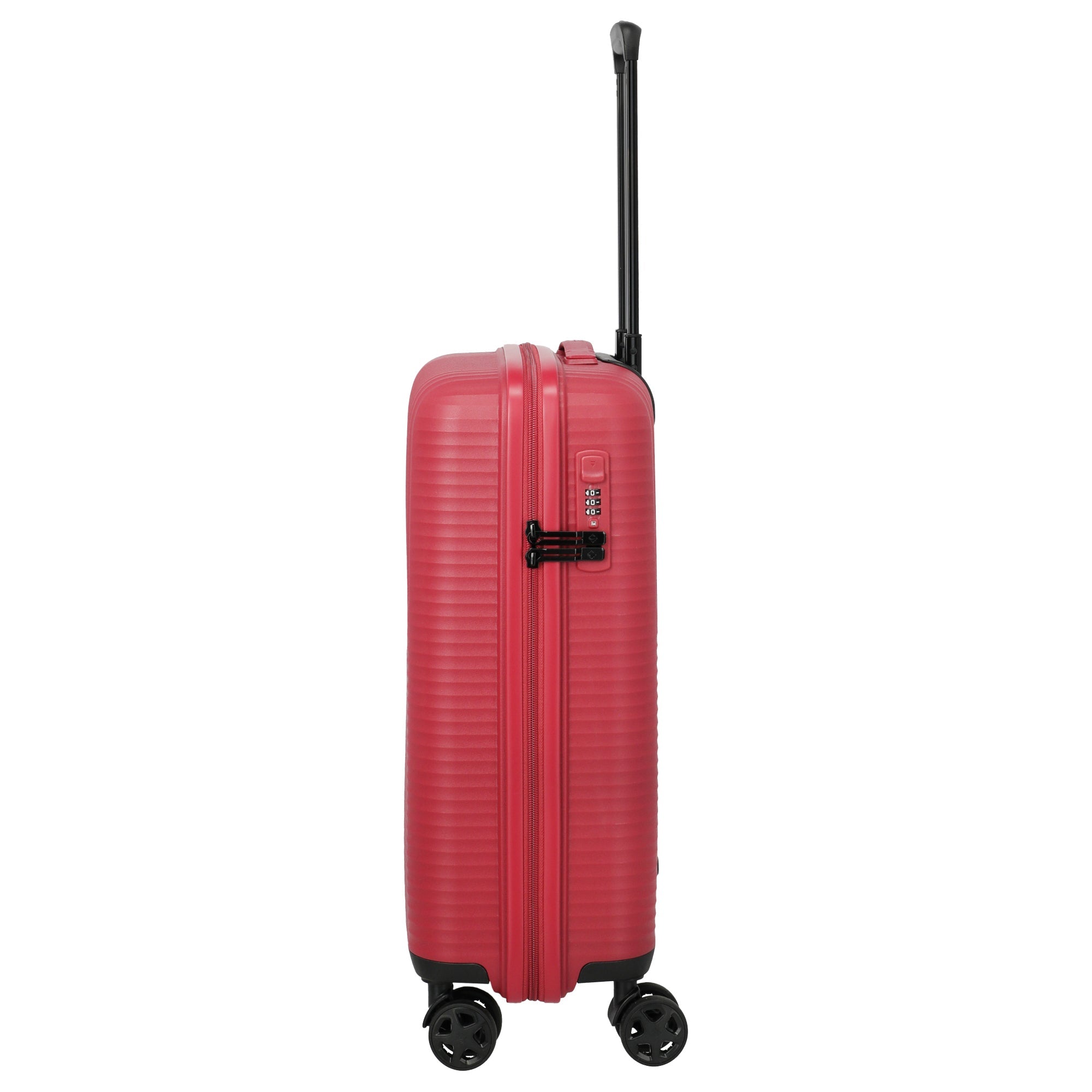 Il Travelite Air Stripe trolley da cabina con 4 ruote in rosso combina un peso ridotto con un'alta stabilità, risultando ideale per viaggi flessibili. La robusta struttura in polipropilene protegge efficacemente il bagaglio, mentre le quattro ruote doppie silenziose permettono una manovrabilità senza sforzo.
