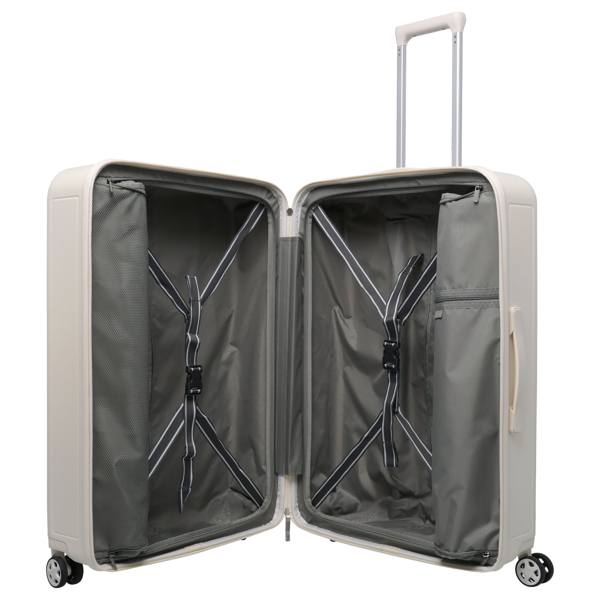 Questo trolley a 4 ruote in elegante avorio unisce funzioni pratiche a un design moderno ed è ideale per i viaggiatori frequenti che danno importanza a sicurezza e comfort.
