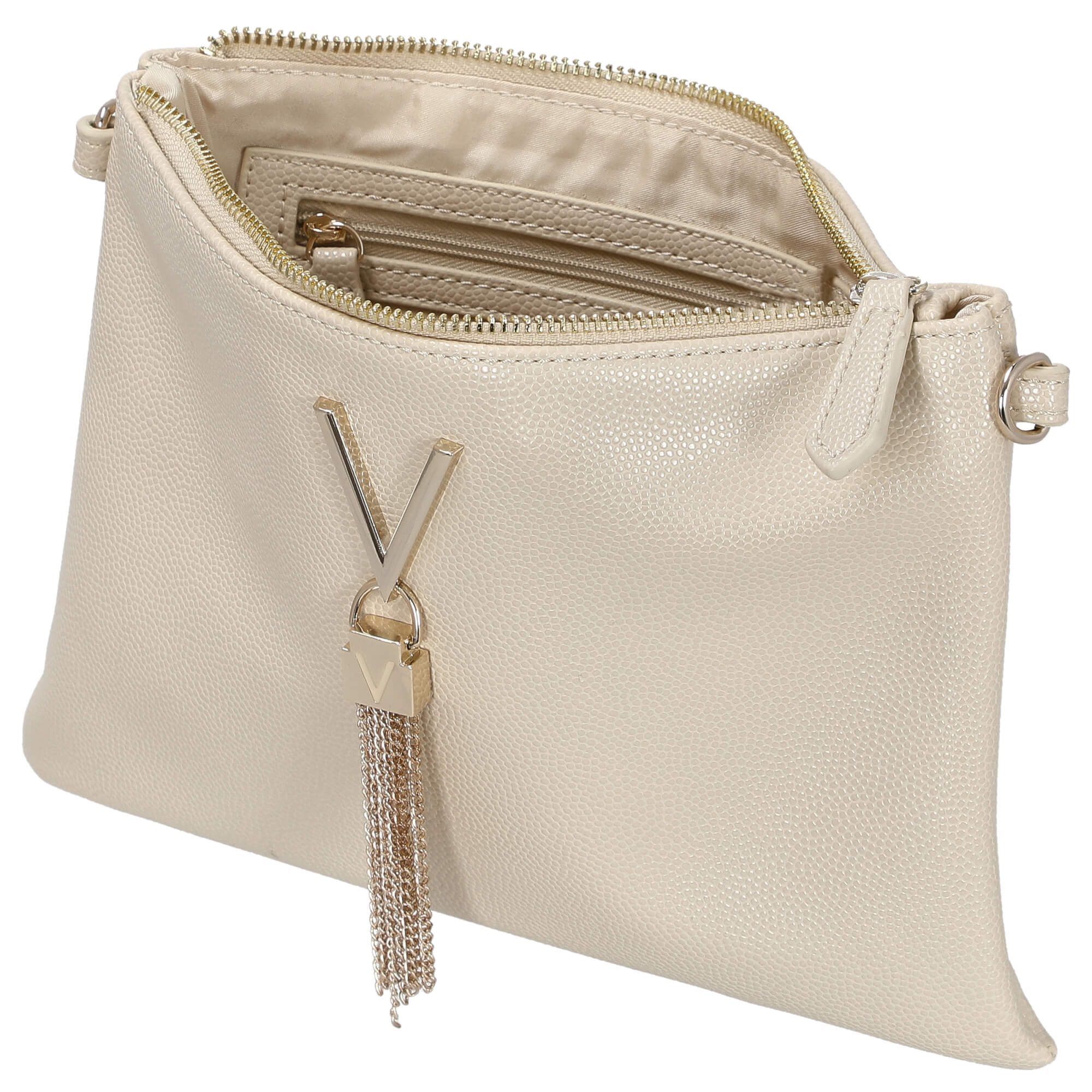 Scoprite la borsa a tracolla beige della esclusiva collezione Divina di Valentino Bags. Questa borsa unisce un design elegante e una funzionalità pratica, rendendola il compagno perfetto per ogni occasione.