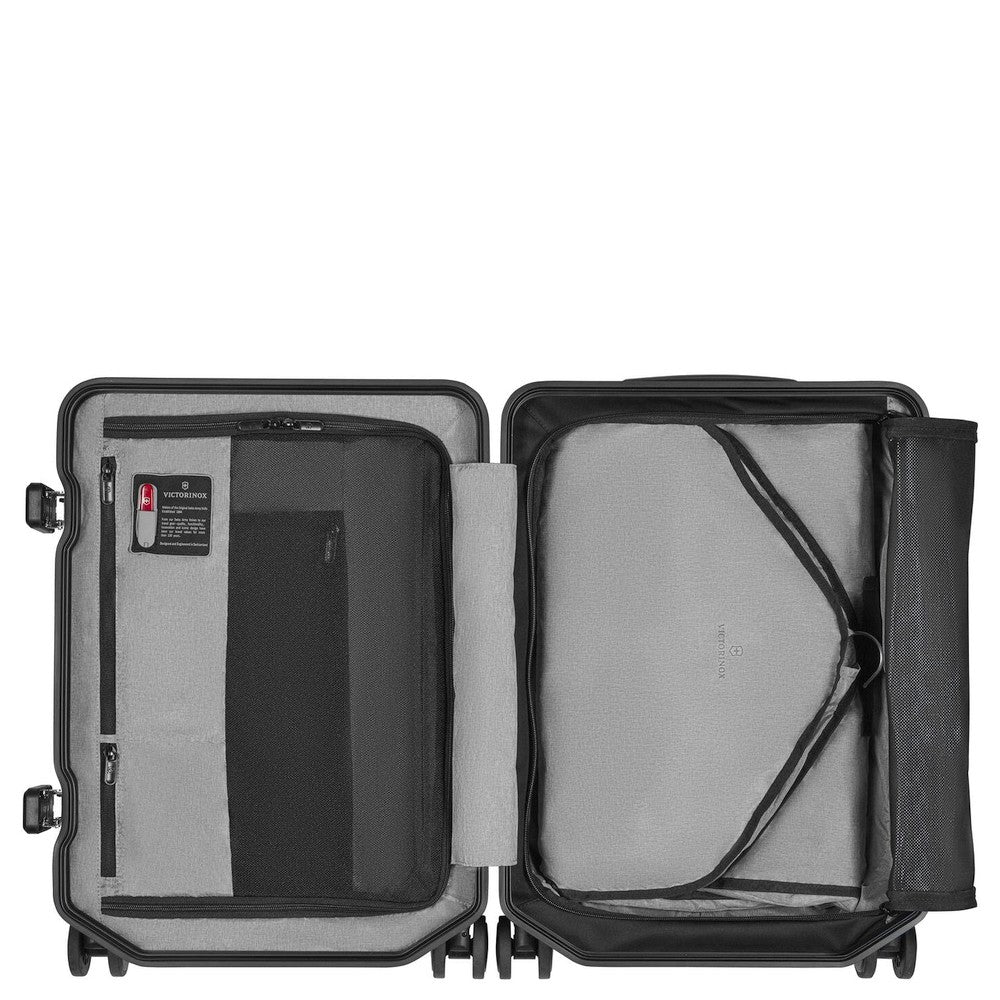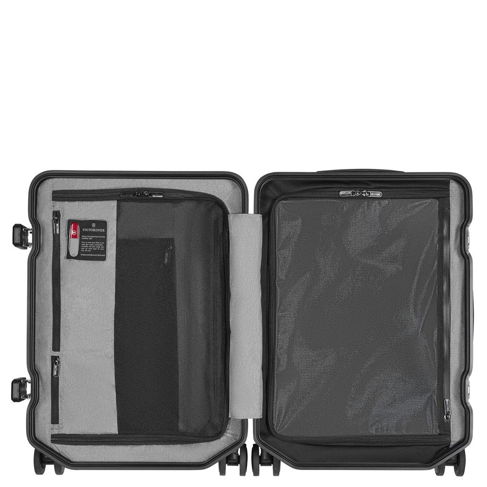 Il Victorinox Lexicon Framed Hardside Cabina Trolley in Nero unisce un design moderno a una funzionalità ben pensata, rendendolo così la scelta ideale per i viaggiatori attenti allo stile.
